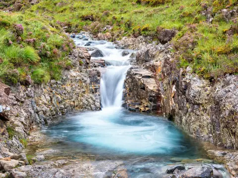 استكشف برك الجنيات الساحرة والمشهورة بمياهها الصافية وأزهارها البرية. يمتلئ جانبا بركة الجنيات بأزهار أرجوانية بديعة، غاية في الجمال، تُحيط بكل شيء فيها. تمر بركة الجنيات الطويلة والضيقة والمتعرجة عبر هذه الزهرة الجبلية الأرجوانية الرومانسية. كلما صفت السماء، تتسلل أشعة الشمس الدافئة والمشرقة عبر السحب الكثيفة على جزيرة سكاي، بجبالها وتلالها وأنهارها وسواحلها، فتبدو ساحرة ومليئة بالألوان، وتنعم العديد من القرى الصغيرة بالهدوء والسكينة، مزينة بأشعة الشمس والضباب، بألوان بدائية خلابة. ننصحكم بالذهاب في جولة سياحية مع المختصين من المنطقة .أضغط هنا